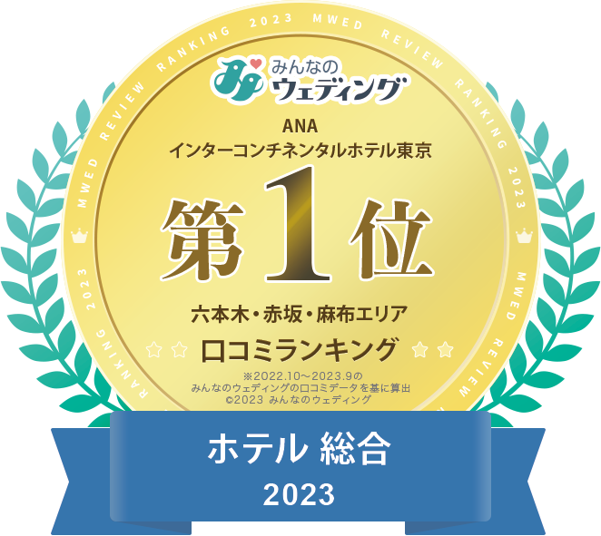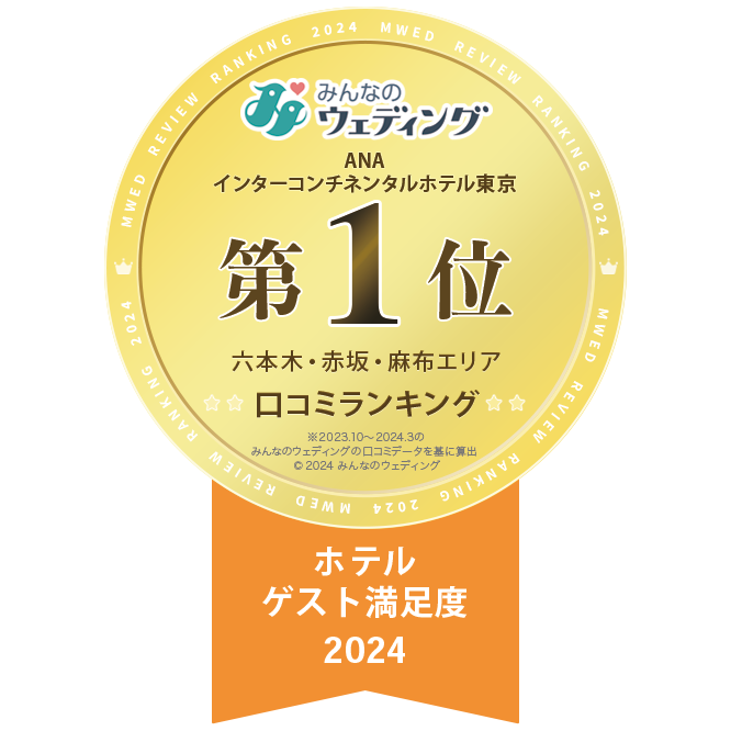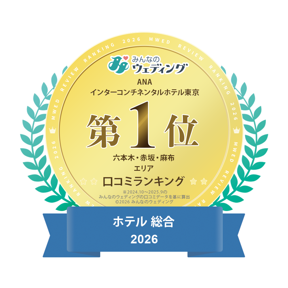 ANAインターコンチネンタルホテル東京は、ウエディング総合サイト"みんなのウェディング"にて、六本木・赤坂・麻布エリア「ホテル総合」7年連続1位、「本番満足度」1位、「ホテルゲスト満足度」1位を受賞しています。
